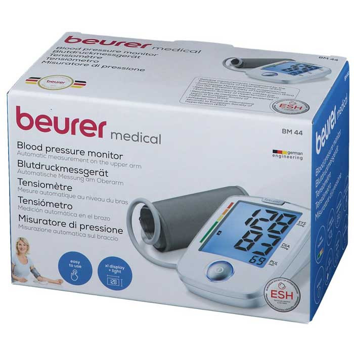 فشارخون سنج بازویی بیورر Beurer مدلBM44 محصولی کاربردی برای اندازه گیری فشارخون و اطلاعاتی همچون ضربان قلب و تحلیل داده های مربوط به آن است.این دستگاه مجهز به سیستم اتوماتیک ورود هوا به دستگاه بوده و در محدوده اندازه گیری فشارخون 0 تا 300 میلی متر جیوه و محدوده اندازه گیری ضربان قلب دستگاه 40 تا 180 پالس بر دقیقه کارآیی دارد همچنین این قابلیت را دارد که بی نظمی در ضربان قلب (آریتمی) را تشخیص داده و اعلام کند. دستگاه با چهار عدد باتری 1.5 ولت قلمی تغذیه می شود و در صورت اتمام شارژ باتری ها نشانگر تعویض باتری بر روی صفحه نمایش ظاهر می گردد. پنل دستگاه دارای یک کلید فشاری وصفحه LCD بزرگ می باشد، بر روی این صفحه نمایش می توان اطلاعات مربوط به فشار سیستولیک، فشار دیاستولیک، ضربان قلب، علامت آریتمی قلب ، نشان گر تعویض باتری و حافظه را مشاهده نمود.