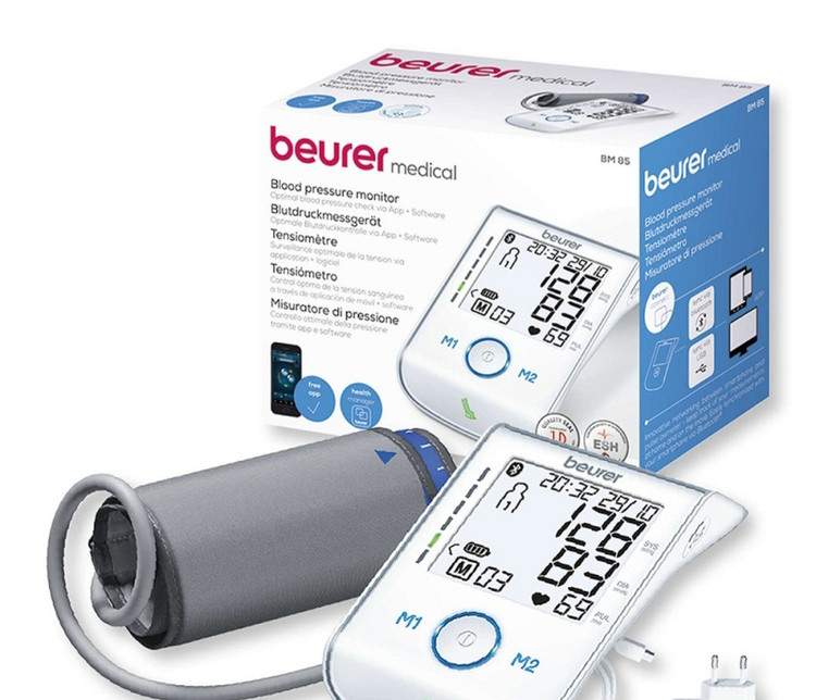 فشارسنج بازویی BM 85 بیورر جهت اندازهگیری کاملا اتوماتیک فشارخون و ضربان قلب از روی بازو میباشد. از ویژگیهای این محصول وجود باتری لیتیوم یونی داخلی و بلوتوث، نرم افزار مخصوص هلث منیجر مخصوص گوشی های هوشمند، دکمه لمسی، حافظه 60×2، نشانگر حالت استراحت، نمایش زمان و تاریخ، نگهدارنده کاف، سیستم خاموشی خودکار و تشخیص آریتمی میباشد. این محصول متوسط فشارخون اندازهگیری شده در 7 روز گذشته را به شما نشان میدهد و مناسب استفاده دور بازوی 22 تا 42 سانتیمتر میباشد. از وسیله همراه این محصول باتری و کیف میباشد. این محصول دارای جایزه طراحی Reddot 2014، شاخص سازمان بهداشت جهانی (WHO)، قابلیت نصب رایگان نرم افزار HealthManager برای برنامه ریزی و نظارت بر آموزش و مدیریت بهداشت و درمان، جایزه Plus X 2014 و برنده جایزه Technik Zu Hause است.